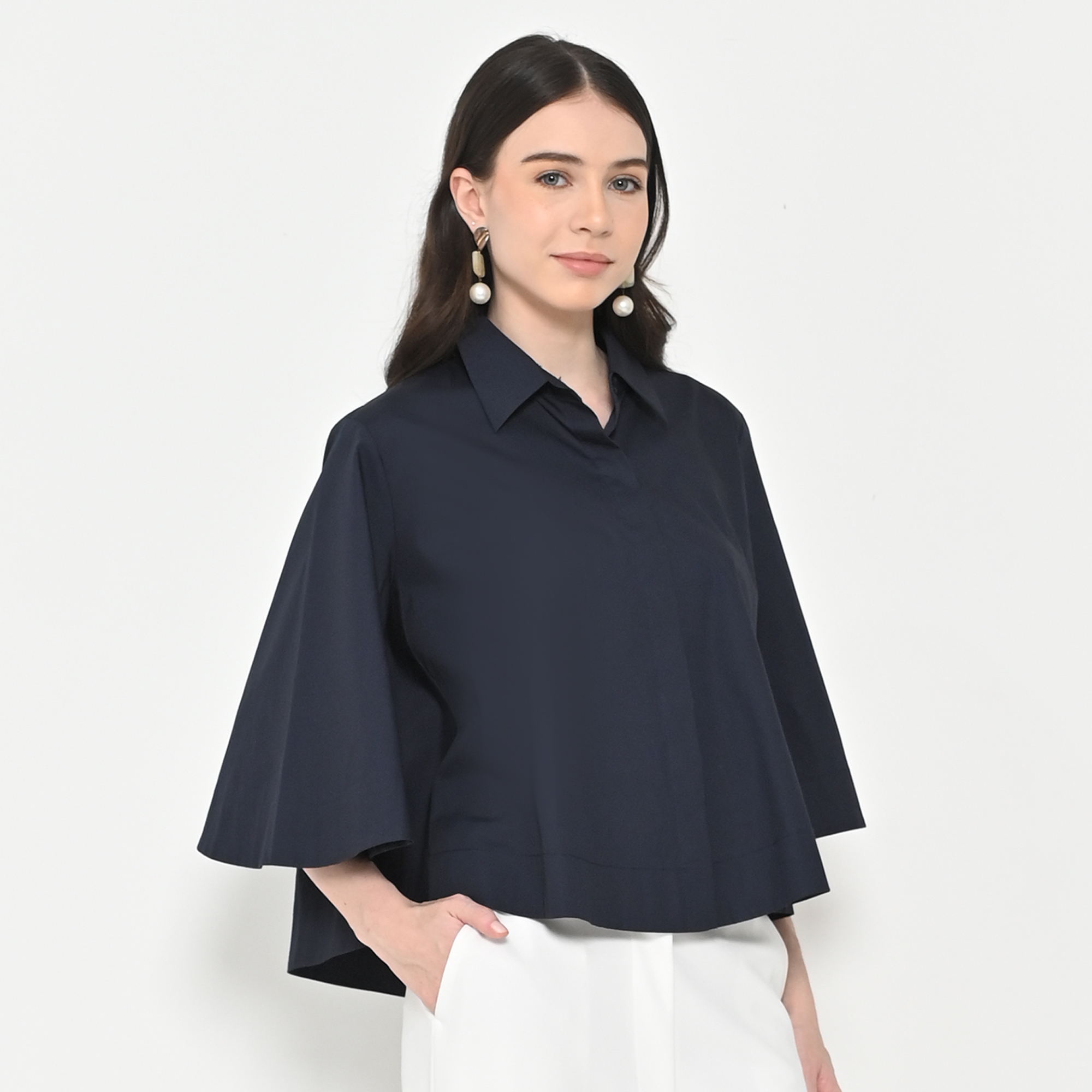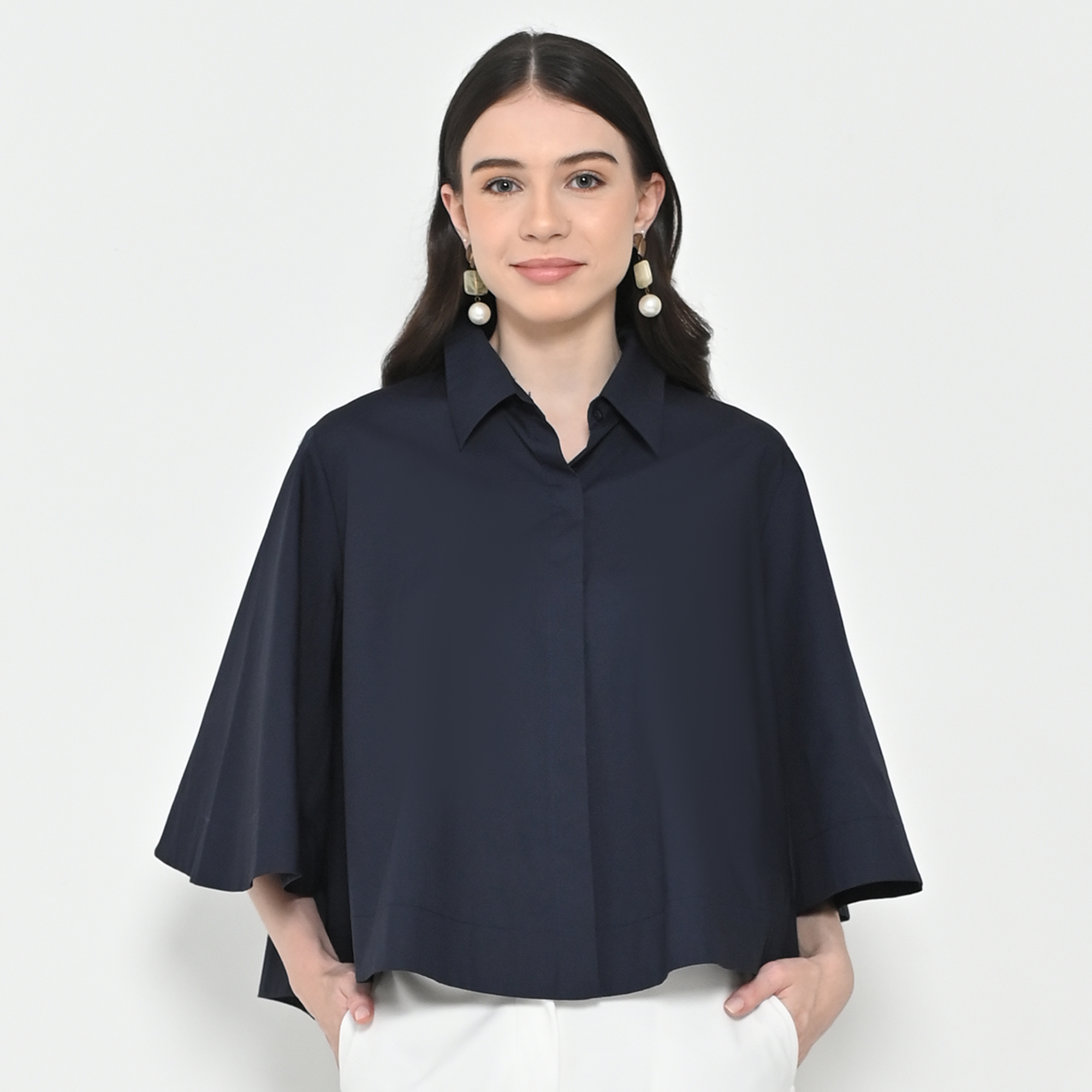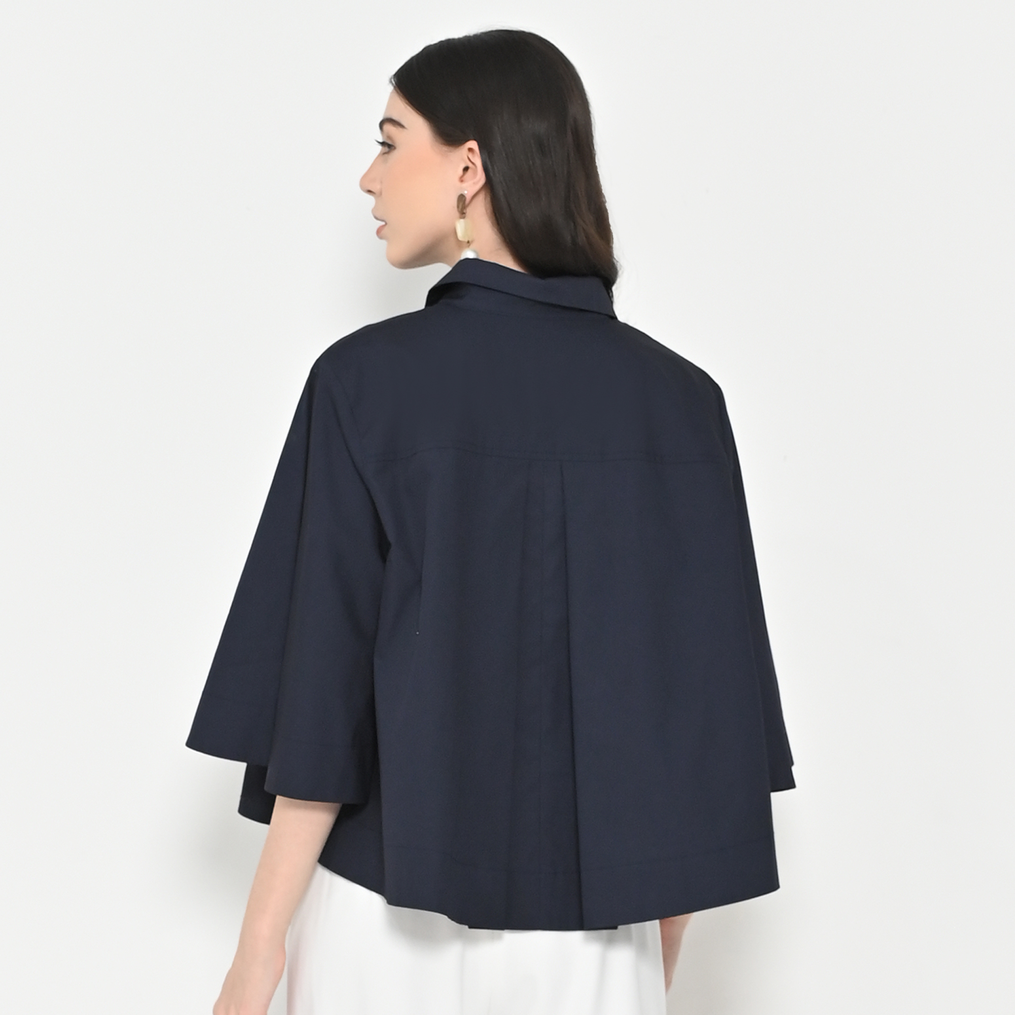 – Lengan lebar (flare sleeves), kerah kemeja, kancing depan tersembunyi