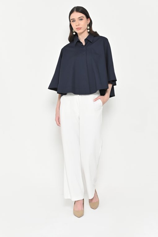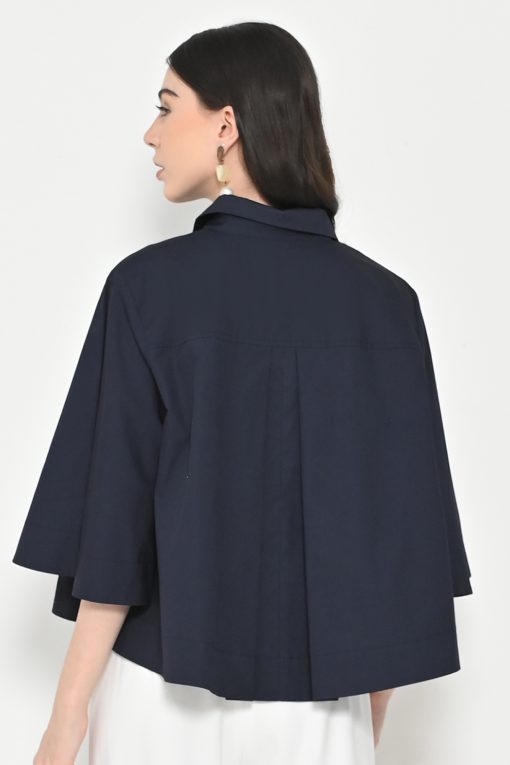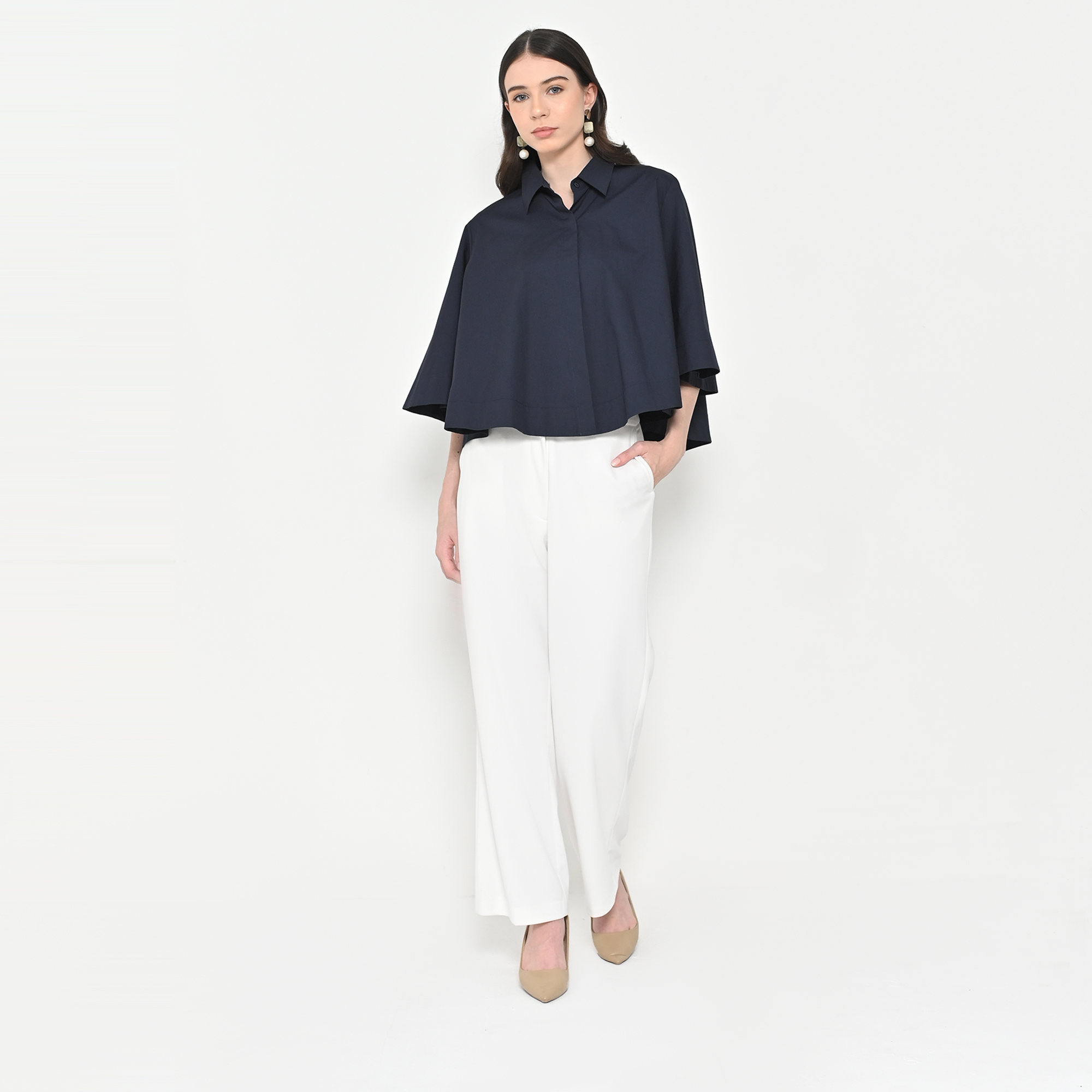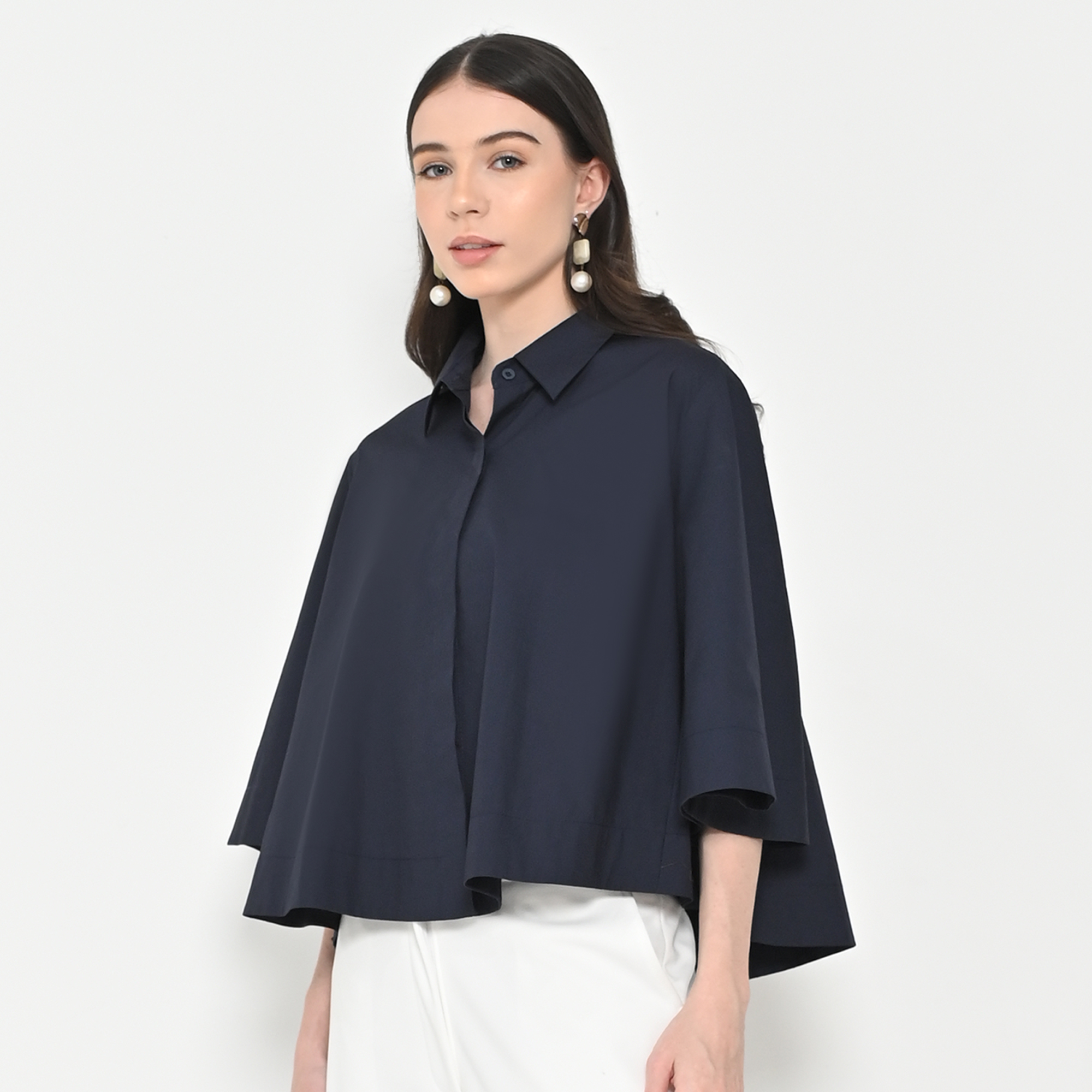 – Lengan lebar (flare sleeves), kerah kemeja, kancing depan tersembunyi