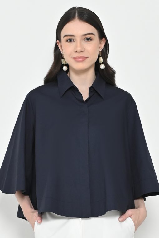 – Lengan lebar (flare sleeves), kerah kemeja, kancing depan tersembunyi